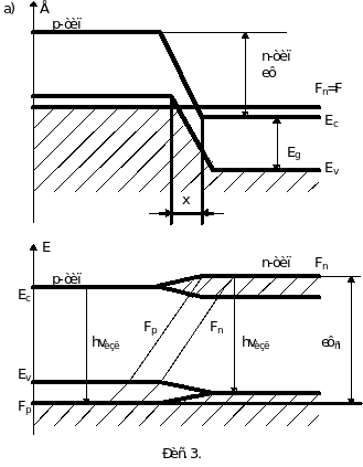 выведен из состояния термодинамического равновесия, причем в нем созданы одновременно высокие концентрации электронов в зоне проводимости и дырок в валентной зоне. Электроны переходят в состояние с некоторой энергией Fn вблизи потолка валентной зоны. Рассматриваемая ситуация иллюстрируется диаграммами, приведенными на рис. 1. Так как все состояния вблизи дна зоны проводимости заполнены электронами, а все состояния с энергиями вблизи потолка валентной зоны заполнены дырками, то переходы с поглощением фотонов, сопровождающиеся увеличением энергии электронов становятся невозможными. Единственно возможными переходами электронов в полупроводнике в рассматриваемых условиях являются переходы зона проводимости - валентная зона, сопровождающиеся рекомбинацией электронно-дырочных пар и испусканием электромагнитного излучения. В полупроводнике создаются условия, при которых происходит усиление электромагнитной волны. Иными словами, коэффициент поглощения получается отрицательным, а рассматриваемая ситуация отвечает состоянию с инверсной плотностью населенности.
