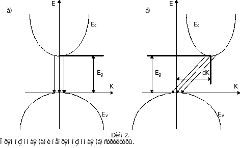 Оптическим переходам с сохранением квазиимпульса соответствуют вертикальные в k-пространстве (прямые) переходы. Сохранение квазиимпульса в процессе излучательного перехода может рассматриватся как квантомеханическое правило отбора (в том случае, когда в акте излучательной рекомбинации не принимают участие третьи частицы, например, фононы или атомы примесей).Невертикальные в k-пространстве (непрямые) переходы имеют значительно меньшую вероятность по сравнению с прямыми переходами, так как в этом случая требуется сбалансировать некоторый разностный квазиимпульс dk (рис. 2).