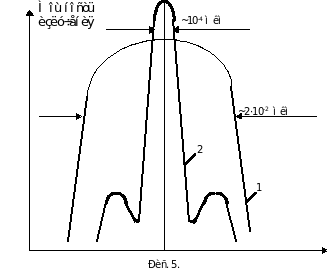 Лазерный диод не сразу начинает излучать при приложении к нему напряжения от внешнего источника. При малом токе имеет место спонтанное излучение (рис. 5) с шириной спектра излучения в несколько сот микрометра. По мере нарастания тока накачки в области p—n-перехода создается высокая степень инверсии населенности и излучается больше света. Отдельные фотоны многократно проходят строго в плоскости p—n-перехода и перпендикулярно к торцам диода усиливаются. С возрастанием тока накачки испускаемое диодом излучение существенно сужается одновременно по ширине спектра и по пространственной расходимости. Когда возникает индуцированное излучение, интенсивность излучения увеличивается за счет образования большого количества электронно-дырочных пар в единицу времени. Спонтанное излучение подавляется вследствие того, что образовавшиеся первоначально фотоны повторяют себя при прохождении через активную область. Излучение лазерного диода, полученное при плотностях тока выше порогового, являются когерентными. При этом форма кривой спектрального распределения резко изменяется от широкой кривой распределения спонтанной эмиссии 1 к кривой с несколькими узкими модами 2 (рис. 5).