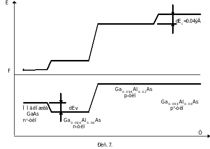 Для улучшения выходных характеристик гетероструктурного лазера в процессе получения гетероструктуры создают условия, обеспечивающие ограничение носителей заряда в активной области. Для структуры, изображенной на рис. 6, б, диаграмма энергитических зон приведена на рис. 7. Из-за того, что ширина запрещенной зоны у полупроводника больше в области с увеличением концентрацией атомов Al, возникают смешения в зоне проводимости на p—p+-переходе (dEc) и в валентной зоне на n—p- и