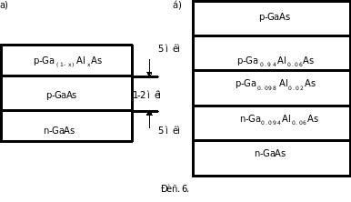 Формула (5) справедлива для приближенных расчетов. Из формулы (5) также следует, что для уменьшения I необходимо уменьшать D и наиболее оптимальным условием будет D=d . Но практически это условие трудно осуществить на обычном лазерном диоде, так как генерируемая в окрестности p—n-перехода световая волна распространяется не только в активной области, но и за ее пределами, где не выполняются условия инверсности населенности. Еще одной причиной является то, что часть инжектируемых электронов, обладая большой длиной свободного пробега, протаскивает активную часть p—n-перехода и не участвует в образовании электронно-дырочных пар. По этим причинам необходимо ограничить зону распространения генерируемого света и инжектируемых электронов и обеспечить условия, чтобы эти процессы протекали только в активной области. Желаемые свойства оптического ограничения могут быть получены на гетеропереходных структурах. Самым простым из них является лазер с одинарным гетеропереходом (ОГ), представленный на рис. 6, а. Излучающий p—n-переход образуется между GaAS и Ga(1-x)AlxAs посредством специальной технологической обработки. Если концентрации примесей примерно одинаковы на обеих сторонах p—n-перехода, то инжекционный ток будет существовать за счет электронов, инжектируемых в слой p-типа, поскольку эффективная масса электронов почти на порядок меньше эффективной массы дырок. Поэтому слой с инверсной населенностью будет находится в p-GaAs, толщина которого соизмерима с длинной диффузии инжектирумых электронов. Таким образом, область инверсии населенности ограниченна толщиной, где в основном и происходит рекомбинация электронов с последующим излучением.