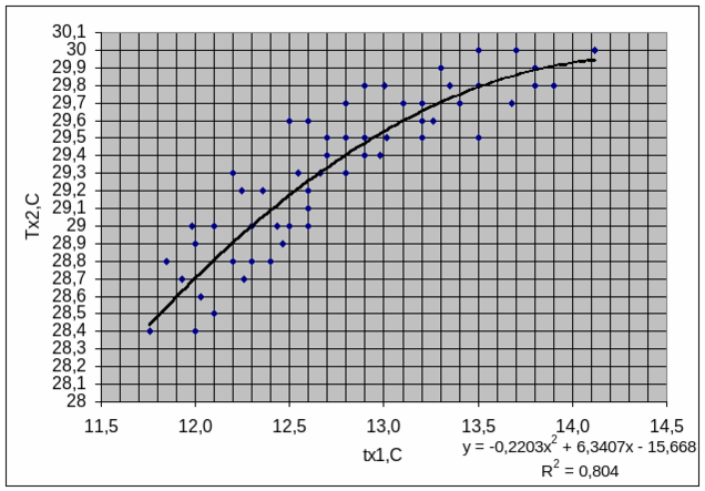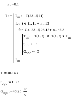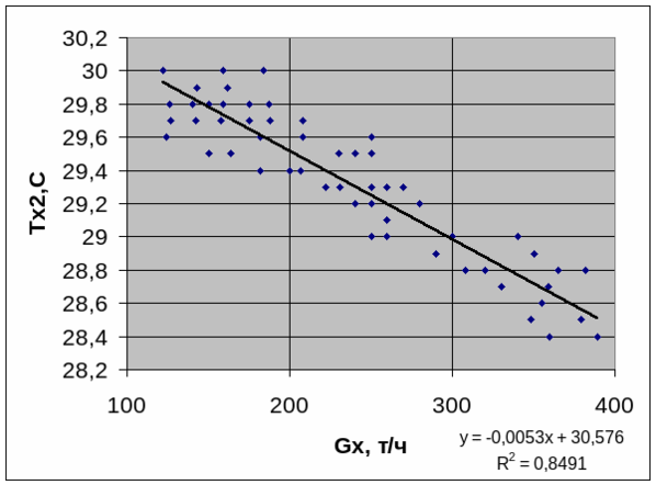 Оптимизация процесса теплообмена было проведено по статической функции объекта T(G,t) = 26,664 – 0,0036·G + 0,274·t. Выяснилось, что