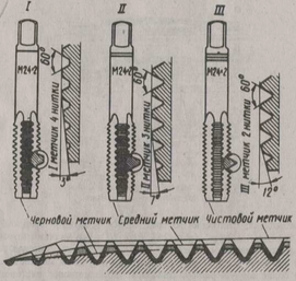 В комплект, состоящий из трёх метчиков, входят черновой, средний и чистовой метчики (рис. I, II, III).