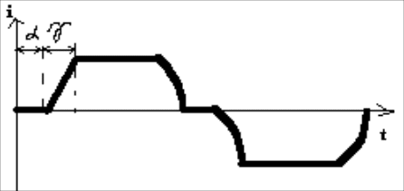 Форма кривой зависит от угла управления a, задаваемого системой импульсно-фазового управления, и угла коммутации g.