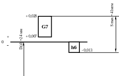 | Параметры деталей посадки | Отверстие | Условное обозначение Допуск, мм TD Основное отклонение Предельное отклонение верхнее ES = TD + EI ES = 0,021 + 0,007 = 0,028 (мм) нижнее EI Предельные размеры Dmax = D + ES; Dmax = 24 + 0,028= 24,028 (мм) Dmin = D + EI; Dmin = 24 + 0,007 = 24,007 (мм) | 24 G7 0,021 (EI) +0,028 +0,007 24,028 24,007 |