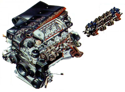 Двигатель автомобиля «Мерседес-Бенц-S500 » (Евро IV) с регулируемым впускным трубопроводом, тремя клапанами на цилиндр, одним распределительным валом в головке, роликовыми толкателями и системой отключения четырёх из восьми цилиндров при работе с неполной нагрузкой: 4966 см3; 220 кВт/299 л.с.; 460 Нм при 3000 об/мин.
