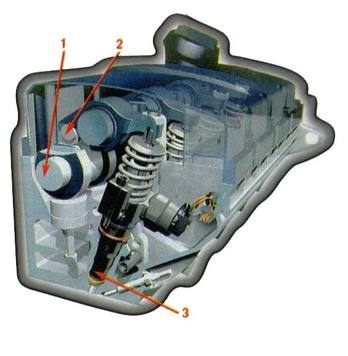 Как следует из самого названия, этот узел объединяет в одно целое насос и форсунку. Расположен он непосредственно около каждого цилиндра в головке двигателя. Усиленный кулачковый вал воздействует на поршень насосной части через рычаг, снабженный роликовым подшипником, что исключает трение скольжения.