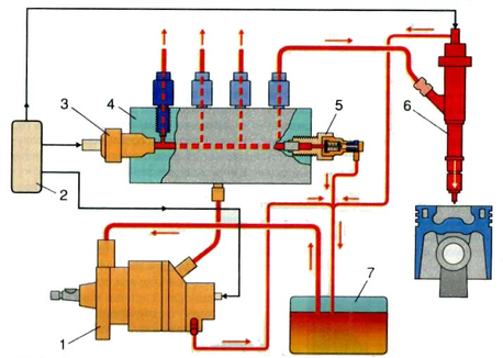 5 – обратный клапан; 6 – форсунка с электронным управлением; 7 – топливный бак.