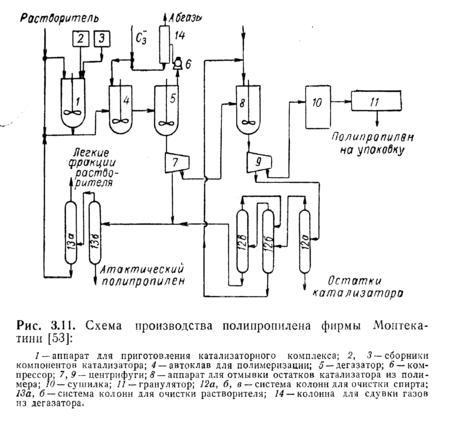 Полученный в результате стереоспецифической полимеризации продукт наряду с изотактическим полимером содержит также некоторое количество атактической фракции и так называемые стереоблокполимеры, в макромолекулах которых чередуются на противоположных сторонах цепи не отдельные группы СНз, а целые изотактические участки этих групп. Катализатор находится в массе образовавшегося полимера, и поэтому его необходимо либо удалить, либо перевести в химически инертную форму, не вызывающую деструкции и нежелательного окрашивания полимера. Содержание аморфных и стереоблочных фракций оказывает влияние на способность полимера к переработке и свойства получаемых изделий и должно быть отрегулировано в соответствии с назначением полимера. Другим параметром, который необходимо варьировать в широких пределах в зависимости от назначения полимера, является величина молекулярного веса.