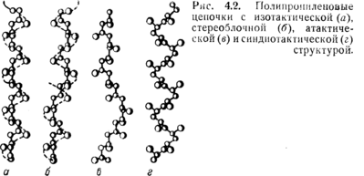 Полипропилен характеризуется более сложной молекулярной структурой, чем большинство производимых промышленностью полимеров, так как, помимо химического состава мономера, среднего молекулярного веса и молекулярновесового распределения, на его структуру оказывает влияние пространственное расположение боковых групп по отношению к главной цепи. В техническом отношении наиболее важен и перспективен изотактический полипропилен. В зависимости от типа и соотношения присутствующих стереоизомеров свойства полипропилена изменяются в широком диапазоне.