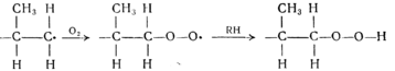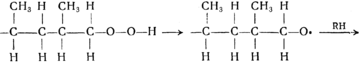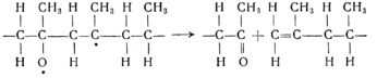 3. Группы —С—О. в структурах, возникших по реакциям I, За и I, 3б, действуют как одиночные группы —С—О. .Итак, гидроксильные группы появляются в цепи по реакциям II, 1а и II, 1б. Группы С=0 образуются по реакциям II, 1б и II, 2, двойные связи—по реакции II, 2, ацетальдегид и формальдегид—по реакциям II, 1б. Снижение молекулярного веса полипропилена вызывают реакции II, 1б и II, 2. Вода образуется при бимолекулярном распаде гидроперекисей.
