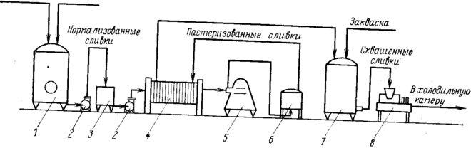 1 - ємність для вершків: 2 - насос; 3 - зрівняльний бак; 4-пластинчаста пастеризаційна-охолоджувальна установка; 5 - гомогенізатор; 6 - витримувач; 7 - ємність для виробітки кисломолочних продуктів; 8 - автомат для фасування.