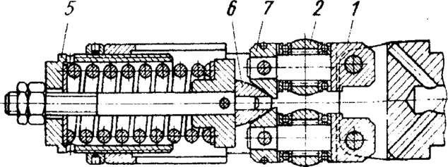 Двух роликовый раскатник (рис. 8.2.3), с упругими элементами, для отделочно-упрочняющей обработки детали включает в себя рычаг (1), ролики (2), стакан для регулирования усилия (5), распорный клин (6), опорные сухари (7). [ ]