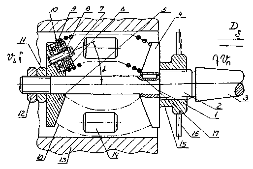 Устройство имеет оправку 1 с резьбовой частью 2 и конусом Морзе 3 для его крепления, например, в пиноли задней бабки токарно-винторезного станка. На оправке размещены конические фланцы 4 и 5 с отверстиями под радиальные 6 и упорные 7 подшипники которые закрепляются на фланцах посредством винта 8. На радиальные подшипники с упором в упорную шайбу 9 надеты деформирующие элементы - цилиндрические пружины 10 таким образом, что в месте контакта их с подшипниками угол между осью пружин и осью оправки составляет = 10…15°. Количество деформирующих пружин для обеспечение высокой эффективности обработки равномерного солового воздействия на обрабатываемый материал, должно быть не менее двух. Контргайки 11 и 12 фиксируют определенное положение фланца 5 на оправке 1. Наружной поверхностью деформирующие элементы - пружины 10 контактируют с обрабатываемой поверхностью детали 13. Для повышения интенсивности силового воздействия на деталь внутри пружин имеются свободно перемещаемые грузы 14 равной массы. При вращении устройства эти грузы, за счет действия центробежных сил, перемещаются в радиальном направлении, воздействуют на внутреннюю поверхность пружин и обеспечивают дополнительное силовое воздействие на деталь. Регулировочная гайка 15 с воротком 16 осуществляет необходимый натяг пружин 10, т. е. изменение силового воздействия (в т.ч. и непосредственно в процессе обработки). Фланцы размещены на шпонках 17.