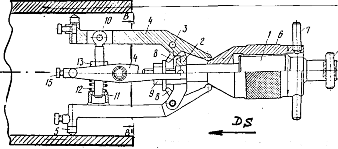 7 - вороток, 8 - уступ, 9 - гайка, 10 - шарнир, 11 - ось, 12 - пружина,
