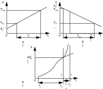 При определении наилучшего приоритета доставки строят несколько подобных кривых для различных грузов, которые вследствие неодинаковой скорости изменения w(t) пересекаются друг с другом, что соответствует перераспределению приоритетов по времени доставки различных грузов. На рис. 1в) изображены две зависимости w(t). На интервале t1-t2 высокий приоритет доставки присваивается более дорогому грузу (жирная линия), а на интервале t2-t3 — более дешевому (тонкая). Перелом кривой в точке t соответствует такому состоянию хранения запасов более дешевого груза, когда появляются дополнительные потери при задержке его доставки. Кривая w(t) после точки перелома с абсциссой t строится непосредственным расчетом величины изменения потерь от уровня запасов е(t).
