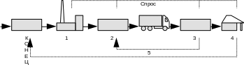 ис. 11. Схема логистической цепи. На рисунке цифрами обозначены: 1 — склад сырья; 2 — производство; 3 — склад готовой продукции; 4 — склад потребителя; 5 — рынок.