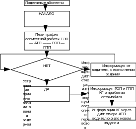 ис. 10. Алгоритм передачи информации при управлении перевозками (присутствует оперативная связь с водителем). Условные обозначения: КГ - координационная группа; АТП - автотранспортное предприятие.