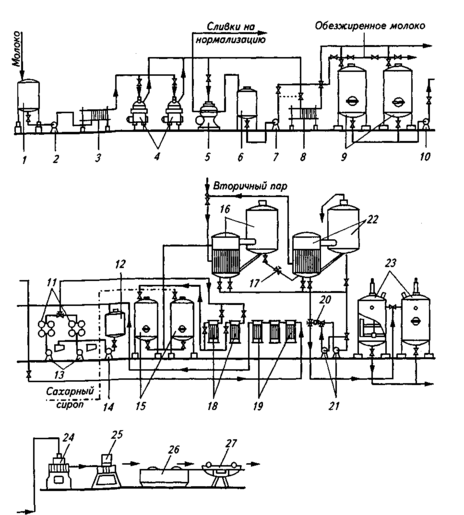 / — приемная емкость; 2, 7, 10, 13, 14, 21 — насосы; 3 — пластинчатый нагреватель; 4—сепара-торы-молокоочистители; 5— сепаратор-сливкоотделитель; 6— емкость для обезжиренного молока; 8— пластинчатый охладитель; 9, 12, 15— емкости; 11 — трубчатые пастеризаторы; 16, 22—'вакуум-аппараты; 17, 20— регуляторы уровня; 18— трубчатые охладители; 19 — трубчатые подогреватели; 23 — вакуум-охладитель; 24— наполнитель; 25— закаточная машина; 26— моечно-сушильны'й агрегат; 27— этикетировочная машина