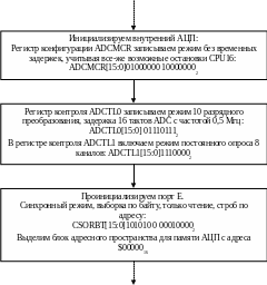 осле того, как пришла команда от пользователя и произведена установка диапазонов, начинается инициализация двух АЦП. Считывание цифровой информации с СОЗУ внешнего АЦП осуществляется при подаче на на вход CS сигнала логический 0. При этом адрес выбора канала определяется в соответствии с значением цифрового кода, записанного в адресные шины А0-А2. При высоком уровне ALE, адрес сначала поступает в регистр адреса, а затем фиксируется низким уровнем ALE. Для подключения памяти данного АЦП и работы с ней нам необходимо выработать сигналы выборки кристалла CS. Блок формирования вырабатывает сигналы CS, для периферийных устройств автоматически, когда мы обращаемся по адресу из адресного пространства, закрепленного за ПУ. Мы имеем СОЗУ размером 64бита. В качестве сигнала выборки кристалла у нас выступает CSBOOT. Далее следует блок схема инициализации:
