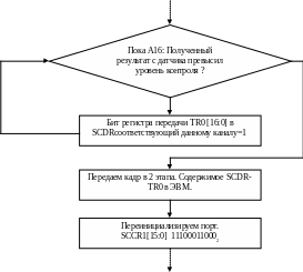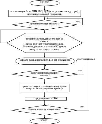 После анализа регистра ADSTAT результат из ADRi считывается в промежуточный регистр D. Затем, согласно блок-схеме, сравнивается уровень для данного канала и, даллее происходит передача полученной информации в ЭВМ.