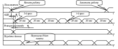 Цикл преобразования обоих АЦП составляет 30 мкс (частота 0,5 МГц и 1,6 МГц). За это время успеют преобразоваться сигналы со всех шестнадцати каналов, передаться измерения в ЭВМ, проанализироваться очередь. Соответственно, за это время можно передать более одного пакета с данными. Таким образом, цикл АЦП полностью определяет цикл работы нашей программы в целом. Сколько будет таких циклов, зависит от пользователя.