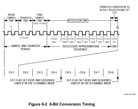 десь видно количество циклов за которое идет 8 битное преобразование. Сначала идет время инициации, которое у нас равно 16 циклам ADC, потом время перевода и резолюции. Всего для преобразования в нашем АЦП потребуется 29 циклов.