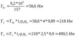 2.10. Определяем крутящие моменты, передаваемые валами механизма с учетом передаточных отношений и КПД: