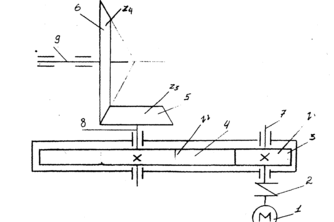 Наш механизм состоит из привода электромашинной (1), муфты (2), цилиндрической шестерни (3), цилиндрические колеса (4), конической шестерни (5), конического колеса (6), валов (7,6,9) и трех пар подшипников качения. Мощность на ведомом валу N3=9,2 кВт, угловая скорость п3= 155 об/мин, привод предназначен для длительной работы, допускаемое отклонение скорости