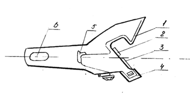 1-большой зуб; 2-замкодержатель; 3-замок; 4-малый зуб; 5-упор; 6-отверстие для клина.