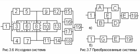 В качестве примера рассмотрим комбинированную систему, представленную на рис. 3.6. Здесь элементы 2 и 5, 4 и 7, 9 и 12, 11 и 14 попарно образуют друг с другом последовательные соединения. Заменим их соответственно квазиэлементами А, В, С, Д, для которых расчет надежности элементарно выполняется по формулам п. 3.1. Элементы 15, 16, 17 и 18 образуют параллельное соединение (п. 3.2), а элементы 3, 6, 8, 10 и 13 - систему “3 из 5” (п. 3.2). Соответствующие квазиэлементы обозначим E и F. В результате преобразованная схема примет вид, показанный на рис. 3.7, а. В ней в свою очередь элементы А, В, С, Д, F образуют мостиковую схему (п. 3.4), которую заменяем квазиэлементом 6. Схема, полученная после таких преобразований (рис.3.7,б), образует последовательное соединение элементов 1, G, E, 19, для которых справедливы соотношения п. 3.1. Отметим, что метод прямого перебора для исходной системы потребовал бы рассмотреть