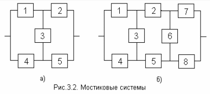 Мостиковая структура (рис. 3.2, а, б) не сводится к параллельному или последовательному типу соединения элементов, а представляет собой параллельное соединение последовательных цепочек элементов с диагональными элементами, включенными между узлами различных параллельных ветвей (элемент 3 на рис. 3.2, а, элементы 3 и 6 на рис. 3.2, б). Работоспособность такой системы определяется не только количеством отказавших элементов, но и их положением в структурной схеме. Например, работоспособность ТС, схема которой приведена на рис. 3.2, а, будет утрачена при одновременном отказе элементов 1 и 2, или 4 и 5, или 2, 3 и 4 и т.д.. В то же время отказ элементов 1 и 5, или 2 и 4, или 1, 3 и 4, или 2, 3 и 5 к отказу системы не приводит.