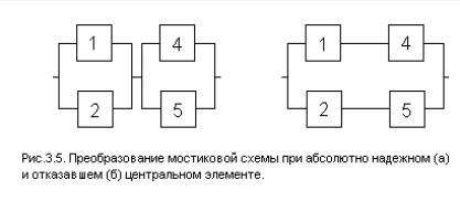 Для расчета надежности мостиковых систем можно воспользоваться методом прямого перебора, как это было сделано для систем “m из n“ (п. 3.3), но при анализе работоспособности каждого состояния системы необходимо учитывать не только число отказавших элементов, но и их положение в схеме (табл. 3.3). Вероятность безотказной работы системы определяется как сумма вероятностей всех работоспособных состояний: