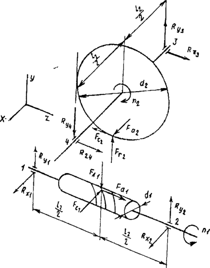 Быстроходный вал (вал 2, рис. 1) редуктора устанавливается на конические роликовые подшипники. Внутреннее кольцо подшипника вращается вместе с валом относительно действующей радиальной нагрузки и имеет следовательно, циркуляционное нагружение.