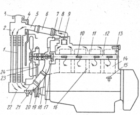 Водяная рубашка 16 двигателя состоит из рубашки блока 14 цилиндров и рубашки головки 11 блока, соединенных между собой отверстиями в прокладке между головкой и блоком. Крыльчатка 17 водяного центробежного насоса и вентилятор приводятся в действие клиновидным ремнем 23. При вращении крыльчатки насоса охлаждающая жидкость нагнетается в водораспределительную трубку 12, расположенную в головке блока. Через отверстия 10 в трубке жидкость направляется к патрубкам выпускных клапанов, благодаря чему охлаждаются наиболее нагретые части головки блока и цилиндров. Нагретая охлаждающая жидкость проходит в верхний отводящий патрубок 8. Если термостат 9 закрыт, то по перепускному каналу 7 жидкость снова поступает к центробежному насосу. При открытом термостате охлаждающая жидкость проходит в верхний бачок 2 радиатора, охлаждается, протекая по трубкам, и поступает в нижний бачок 22 радиатора. Охлажденная в радиаторе жидкость по нижнему подводящему патрубку 18 подводится к насосу.