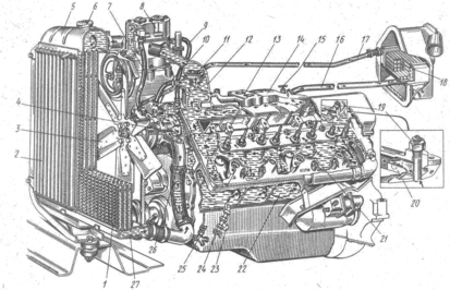 1 – радиатор; 2 — жалюзи; 3 — вентилятор; 4 — водяной насос; 5 и 27 – соответственно верхний и нижний бачки радиатора; б — пробка радиатора; 7 – отводящий шланг; 8 – компрессор; 9 — подводящий шланг; 10 — перепускной шланг; 11 — термостат; 12 — патрубок; 13 - фланец для установки карбюратора; 14 — впускной трубопровод; 15 — кран отопителя; 16 к 17 — соответственно подводящая и отводящая трубки; 18 – радиатор отопителя; 19 — датчик указателя температуры жидкости; 20 - дотирующая вставка; 21 – водяная рубашка головки блока; 22 - водяная рубашка блока цилиндров; 23 — сливной кран рубашки блока цилиндров; 24 — рукоятка привода сливного крана; 25 – сливной кран патрубка радиатора; 26 – подводящий патрубок