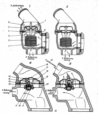 а — жидкость (двигатель автомобиля ГАЗ-24); б — с твердым наполнителем (двигатель автомобиля ЗИЛ-130); I и IV — термостаты открыты; II и III—термостаты закрыты; 1 — корпус водяного насоса; 2 — гофрированный баллон; 3 и 13 — штоки; 4 — прокладка; 5 и 15 — клапаны термостатов; 6 и 16 – патрубки; отводящие горячую жидкость; 7 и 18 — корпусы термостатов; 8 — кронштейн; 9 — баллон термостата; 10 — твердый наполнитель; 11— резиновая мембрана; 12 — направляющая втулка; 14 — возвратная пружина; 17 — коромысло клапана; 19 — буфер; 20 — впускной трубопровод
