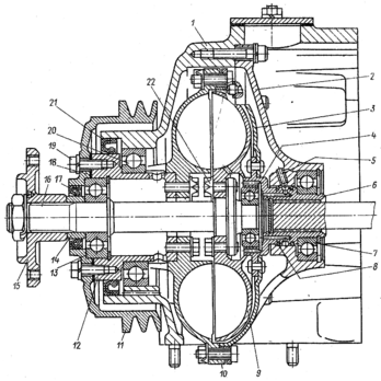 1 — передняя крышка; 2 – корпус; 3 – кожух; 4, 7, 13 и 20 — шарикоподшипники; 5 – трубка подвода масла; 6 — ведущий вал; 8 — уплотнительные кольца; 9 – ведомое колесо; 10 – ведущее колесо; 11 –шкив; 12 — вал шкива; 14 – упорная втулка; 15 – ступица вентилятора; 16 – ведомый вал; 17 и 21 — самоподжимные сальники: 18 – прокладка; 19 и 22 — болты