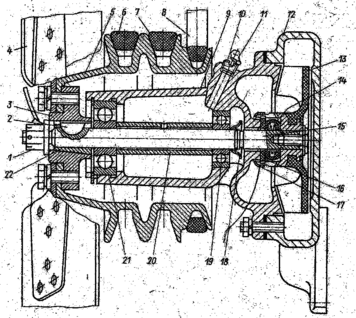 1 — корончатая гайка; 2 — шпонка; 3 — ступица шкива вентилятора; 4 — вентилятор; 5 — шкив; 6 — ремень привода генератора; 7 — ремень привода насоса гидроусилителя; 8 — ремень привода компрессора; 9 — чугунный корпус; 10 — пробка; 11 — масленка; 12 — корпус крыльчатки; 13 — крыльчатка насоса; 14 — самоподжймной сальник; 15 — вал; 16 — графитизированная текстолитовая уплотнительная шайба; 17 — обойма крыльчатки; 18 — отражатель; 19 и 21 — подшипники; 20 — распорная втулка; 22 — разрезная конусная втулка
