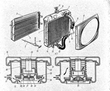 а — общий вид радиатора; б — открыт паровой (выпускной) клапан; в — открыт воздушный (впускной) клапан; 1— стойка; 2 — тяга; 3 — каркас; 4 — жалюзи; 5 — пробка радиатора; б и 22 — горловина радиатора; 7 — верхний бачок; 8 и 12 — гибкие шланги; 9 — направляющий кожух; 10 — отводящий патрубок; 11 — сердцевина радиатора; 13 — сливной краник радиатора; 14 — нижний бачок; 15 — рукоятка привода жалюзи; 16 — фиксатор; 17 — пароотводная трубка; 18 — пружина парового клапана; 19 — корпус пробки; 20 — стойка; 21 — запорная пружина; 23 — паровой (выпускной) клапан; 24 — прокладка выпускного клапана; 25 — прокладка воздушного клапана; 26 — воздушный клапан; 27 — пружина воздушного клапана; 28 — седло воздушного клапана; 29 — отверстие для поступления воздуха