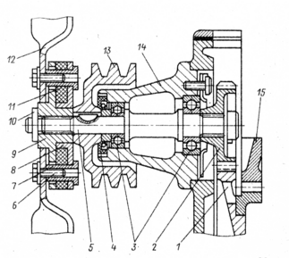 1 — шестерня распределительного вала; 2 — шестерня вентилятора; 3 — шарикоподшипники ; 4 — самоподжимной сальник; 5 — вал вентилятора; 6 — болт; 7 — распорная втулка; 8 — ступица муфты; 9 — ступица крыльчатки вентилятора; 10 — гайка; 11 — резиновая упругая муфта; 12 — крыльчатка вентилятора; 13 — шкив привода генератора и компрессора; 14 — корпус вентилятора; 15 — шестерня привода топливного насоса высокого давления
