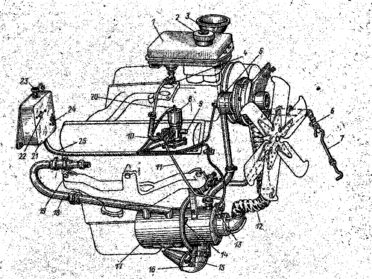 Вентилятор. Для создания воздушного потока, охлаждающего жидкость, протекающую по трубкам радиатора, служит вентилятор, состоящий из крыльчатки и ступицы со шкивом. Иногда к каркасу радиатора для более интенсивного охлаждения в нем жидкости присоединяют направляющий кожух (диффузор), внутри которого вращаются лопасти вентилятора (двигатели автомобилей ГАЗ-53А, ЗИЛ-130, КамАЗ-5320 и др.). Лопасти вентиляторов штампуют из листовой стали или изготовляют из пластмассы (двигатель автомобиля ГАЗ-24 «Волга»).