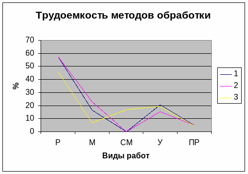 Дальнейший анализ выбранных методов обработки узла проводят по видам работ. Этот показатель характеризует эффективность методов обработки, на сколько велика доля механизированных работ в каждом варианте обработки. Для проведения данного анализа определяют доли времени по видам работ в общей трудоемкости изготовлении узла, по каждому варианту обработки. Полученные результаты заносят в табл. 8 и на графике рис. 4.