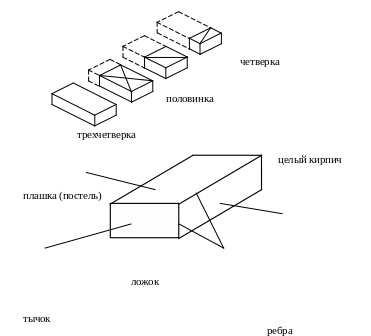 Обыкновенный глиняный кирпич в зависимости от предела прочности имеет марки 75, 100, 125, 150, 200, 250, 300 и выпускается двух видов: ординарный сплошной или пустотелый размером 250х120х65 мм и модульный со сквозными или несквозными пустотами размером 250х120х88 мм массой 4 кг. Для выполнения кирпичной кладки применяют целые и неполномерные кирпичи.