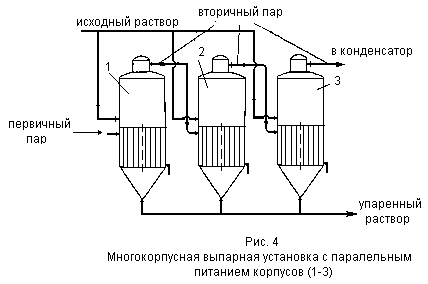 Установки такой схемы используют, главным образом, при выпаривании насыщенных растворов, в которых находятся частицы выпавшей твердой фазы (что затрудняет перемещение выпариваемого раствора из корпуса в корпус), а также в тех процессах выпаривания, где не требуется значительного повышения концентрации раствора.