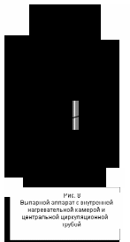 Аппараты с внутренней нагревательной камерой и центральной циркуляционной трубой. В нижней части вертикального корпуса 1 (рис. 8) находится нагревательная камера 2, состоящая из двух трубных решёток, в которых закреплены, чаще всего развальцованы, кипятильные трубы 3 (длиной 2—4 м) и циркуляционная труба 4 большого диаметра, установленная по оси камеры. В межтрубное пространство нагревательной камеры подается греющий пар.