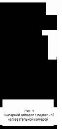Аппараты с подвесной нагревательной камерой. В аппарате такого типа (рис. 9) нагревательная камера 1 имеет собственную обечайку и свободно установлена в нижней части корпуса 2 аппарата. Греющий пар подаётся через трубу 3 и поступает в межтрубное пространство нагревательной камеры, снизу которого отводится конденсат. Поступающий на выпаривание раствор опускается вниз по каналу кольцевого поперечного сечения, образованному стенками обечайки подвесной камеры и стенками корпуса аппарата. Раствор поднимается по кипятильным трубам, и таким образом выпаривание происходит при естественной циркуляции раствора.