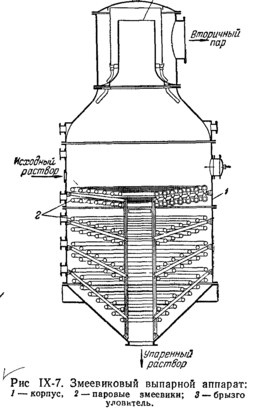 Змеевиковые аппараты более компактны, чем аппараты с рубашками и отличаются несколько большей интенсивностью теплопередачи. Однако очистка и ремонт змеевиков затруднены. В этих аппаратах также производят выпаривание небольших количеств химически агрессивных веществ.