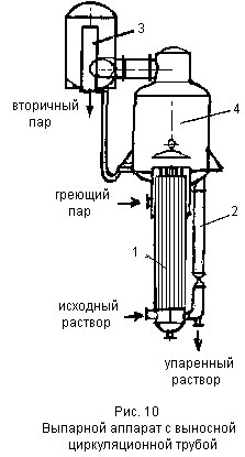 Аппараты с выносной нагревательной камерой. При размещении нагревательной камеры вне корпуса аппарата имеется возможность повысить интенсивность выпаривания не только за счет увеличения разности плотностей жидкости и парожидкостной смеси в циркуляционном контуре но и за счет увеличения длины кипятильных труб.