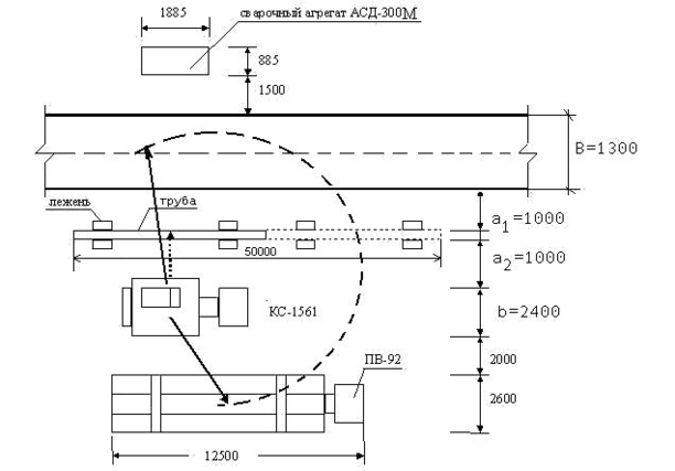 B - ширина траншеи по верху; b - ширина крана в зависимости от марки крана; a1 - расстояние от бровки траншеи до трубы принимается равной 0,7-1м [6-стр.22]; a2 - ширина места, занимаемого звеном (диаметр трубы); a3 – расстояние от трубы до оси крана. Сумма а1,а2 и а3 или расстояние от края траншеи до колес или гусениц крана должна быть не менее 1,5м [5-стр.342,п.46.5.]